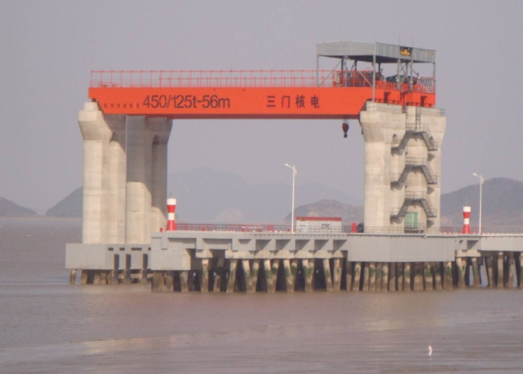 公司设计制造的所有核电厂配套用桥门机、吊车系消化吸收国内外先进技术,结合我公司常规产品的成熟技术,综合核电产品更高的安全可靠性要求,遵照GB/T3811-2008《起重机设计规范》、GB/T14405-2011《通用桥式起重机》、NB/T20234-2013《 核电厂专用起重机设计准则》等标准开发出的核电专用系列产品,技术成熟,安全可靠,检修便利,特别适合核电厂各个厂房内的设备的吊装、搬运就位工作。公司首台台桥机为2006年研发、2007年投入生产的巴基斯坦恰希玛核电75/20t吊车,公司首台台码头固定吊为2008年向三门核电提供的2台450/125t-56m固定式桥机。近14年的发展,已向国内外众多优质客户提供近200台核电吊车设备。目前制造过的跨度最大桥吊为450t-56m,起重量最大为900t固定吊。